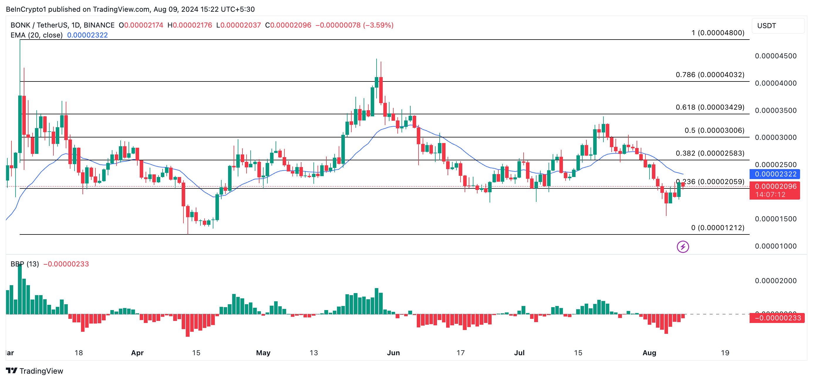 수요일 BONK의 가치 상승에도 불구하고 가격은 지난 20거래일 동안의 평균 거래 가격을 측정하는 20일 지수이동평균(EMA)을 밑돌고 있습니다.
