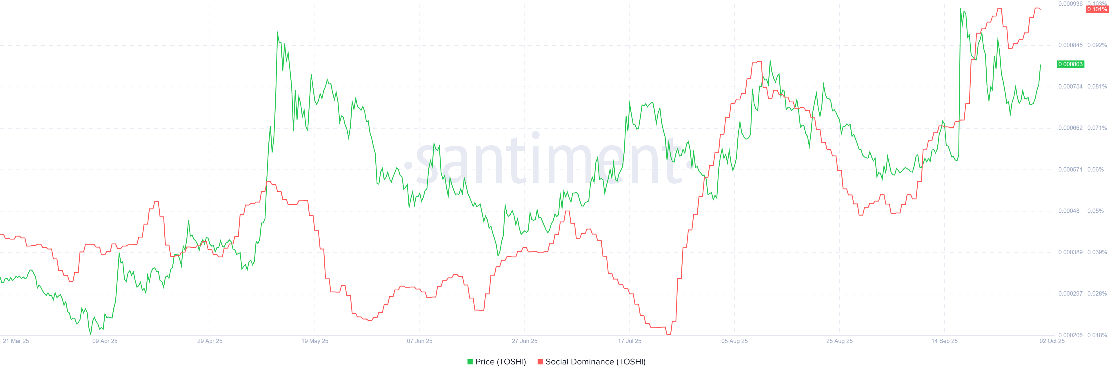 센티멘트에 따르면, TOSHI의 소셜 도미넌스 지표는 두 달 동안 꾸준히 상승하여 3월 이후 최고치를 기록했습니다.