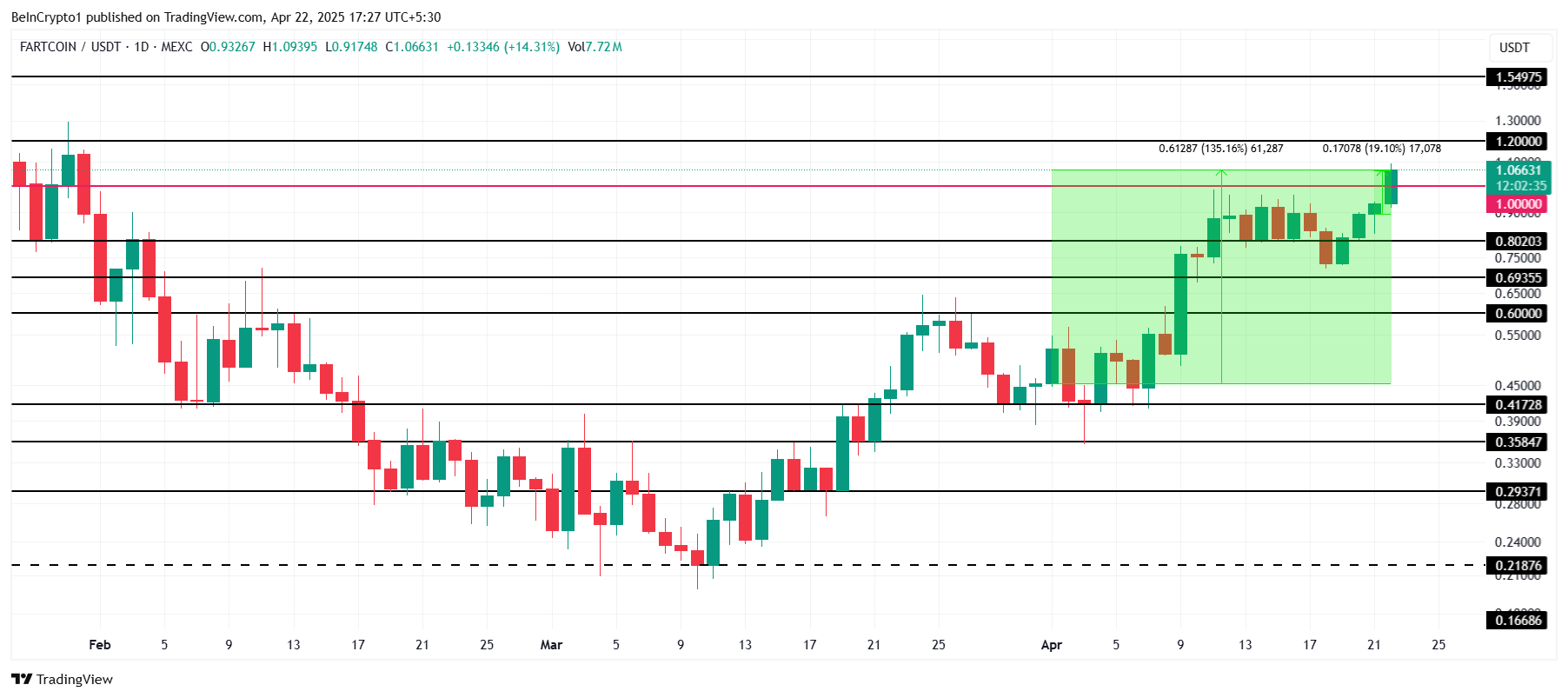 FARTCOIN은 지난 24시간 동안 19% 상승하여 가격이 1.06달러에 도달했습니다. 이 밈코인은 1.00달러를 넘어서며 BONK의 시가총액을 초과했습니다. 이 급등은 FARTCOIN에 대한 투자자들의 관심이 다시 증가했음을 나타내며, 최근 랠리를 더욱 지원합니다.
