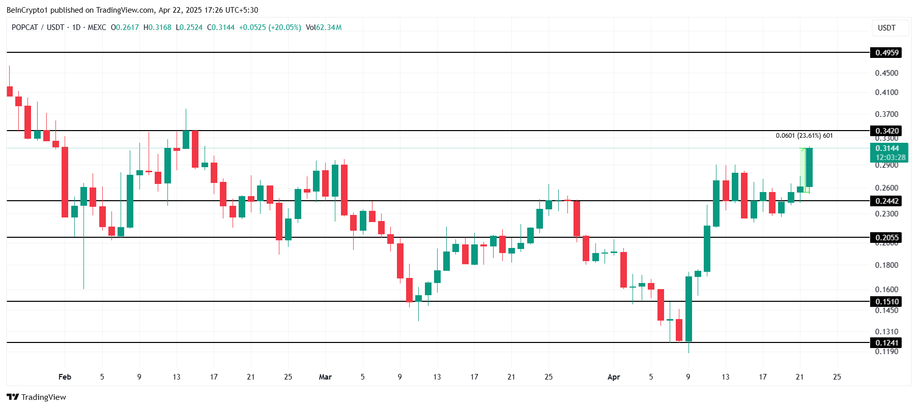POPCAT 가격이 지난 24시간 동안 23.6% 상승하여 0.314달러에 도달했습니다. 이 알트코인은 이제 0.342달러 저항에 근접하고 있으며, 이는 주목해야 할 중요한 수준입니다. 최근 상승은 POPCAT을 잠재적 돌파에 더 가깝게 위치시켰지만, 이 저항을 넘을 수 있는지는 시장 상황에 달려 있습니다.