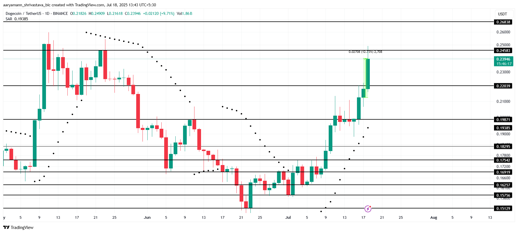 현재 0.245달러에서 저항을 받고 있는 도지코인은 2개월 만에 최고치를 기록했습니다. 캔들스틱 아래의 Parabolic SAR는 DOGE가 앞으로도 상승세를 유지할 가능성이 높음을 나타냅니다. 이 지지가 유지된다면, 밈코인은 더 높은 가격 수준으로 계속 상승할 수 있으며, 더 많은 구매자와 모멘텀을 끌어들일 수 있습니다.