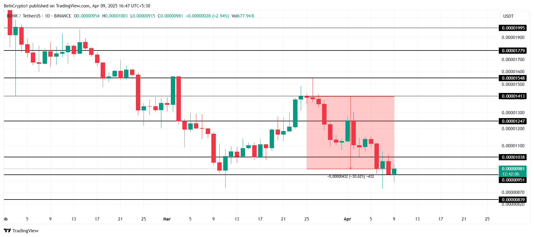 BONK의 가격은 지난 2주 동안 30% 하락하여 0.00000981 달러로 떨어졌습니다. 이 급격한 하락은 밈코인이 3월에 얻은 모든 이익을 지웠습니다. 투자자들이 후퇴하면서 시장 전반의 하락세에 기여하고 코인의 전망을 악화시켰습니다.