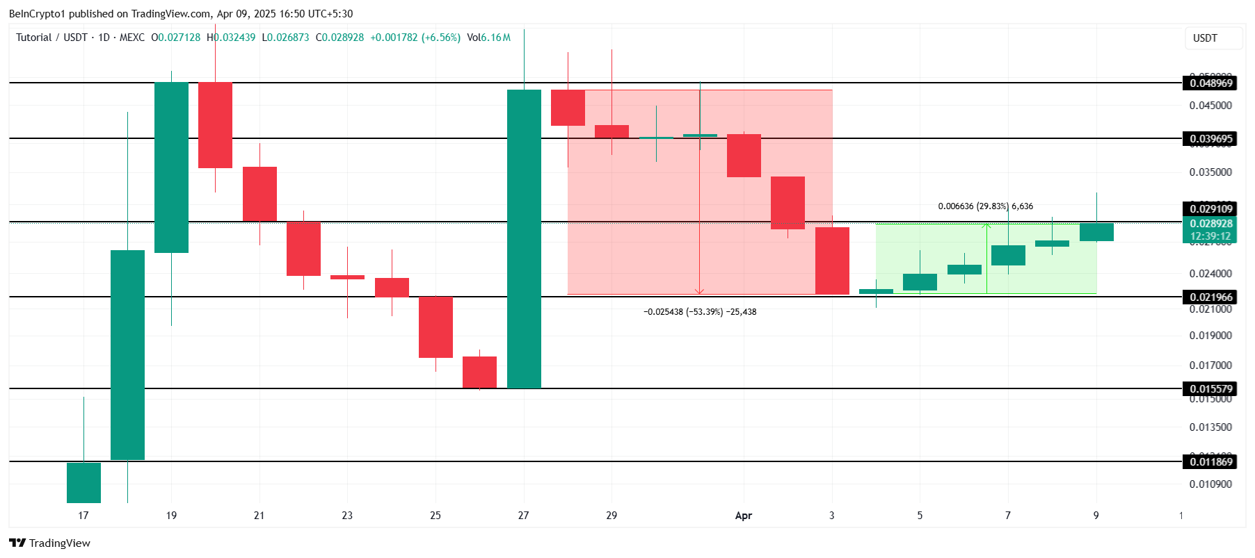 TUT 가격은 이번 주에 거의 30% 상승하여 0.028 달러에 도달했습니다. 이 상승에도 불구하고 3월 말에 관찰된 53% 하락의 절반 정도만 회복했습니다. 밈코인은 여전히 이전 고점을 회복하는 데 어려움을 겪고 있으며, 회복 과정에서 큰 저항에 직면해 있습니다.