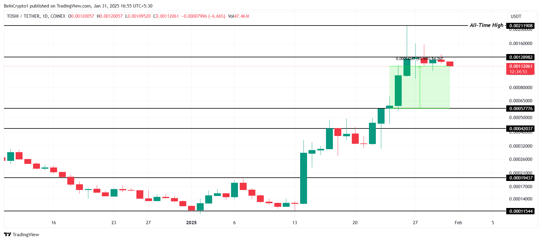 TOSHI는 MOCHI의 강세 모멘텀을 따라 지난주 93% 상승했습니다. 강력한 랠리에도 불구하고, 밈코인은 0.00128달러 저항선 아래에 갇혀 있으며 현재 0.00112달러에 거래되고 있습니다.