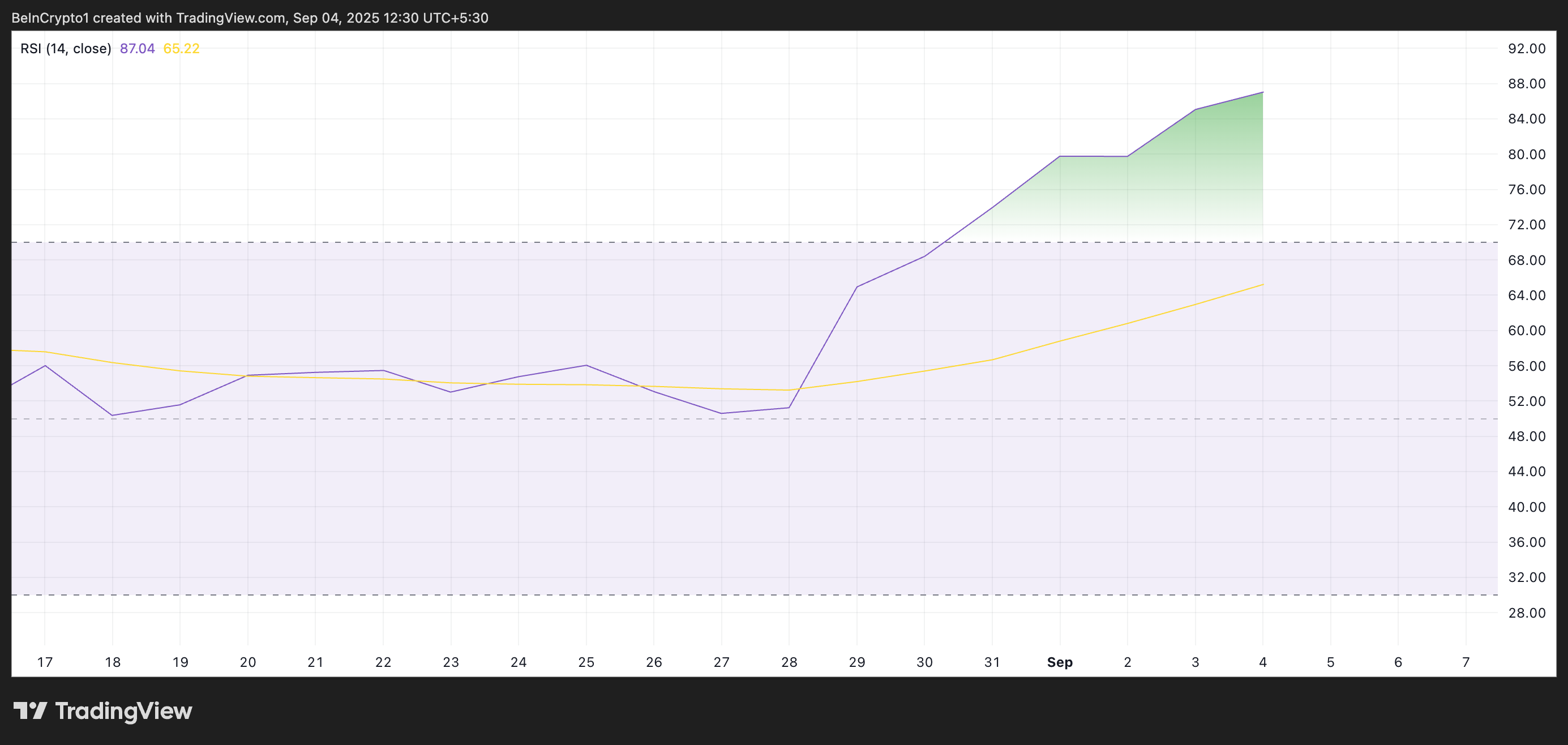 M/USD 일일 차트의 지표는 상대 강도 지수(RSI)가 과매수 상태를 나타내고 있습니다. 이는 상승 모멘텀이 약해질 수 있음을 시사합니다. 현재 이 주요 지표는 87.04로 상승세를 유지하고 있습니다.