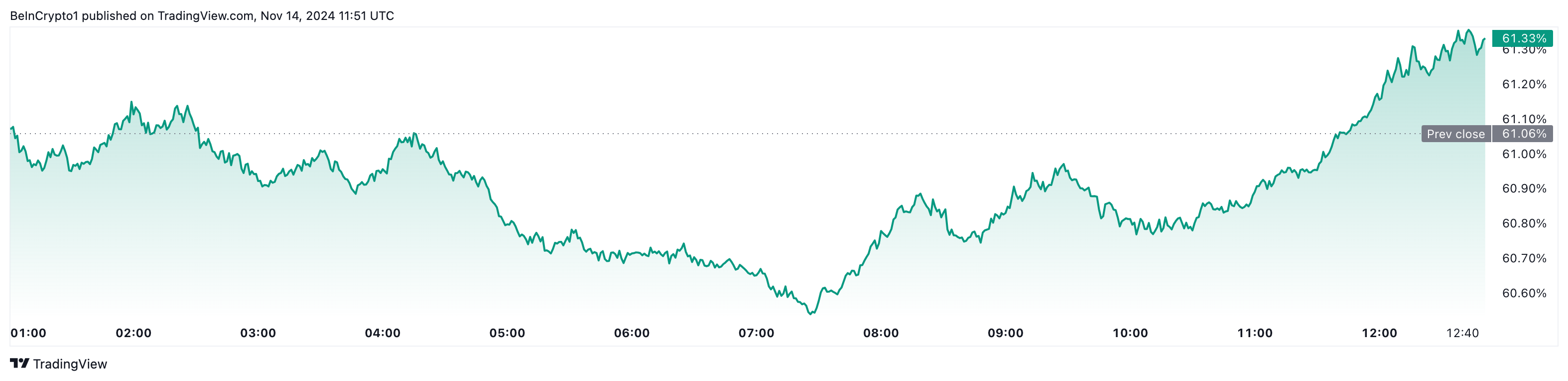Sponsored이 글을 쓰는 시점에서, BTC.D로 알려진 이 비율은 61.33%입니다. 이는 1위 암호화폐가 여전히 시장에서 강력한 영향력을 가지고 있음을 나타냅니다. 알트 시즌이 시작되려면 이 비율이 떨어져야 합니다. 도이치는 11월 12일에 이를 인정했습니다.