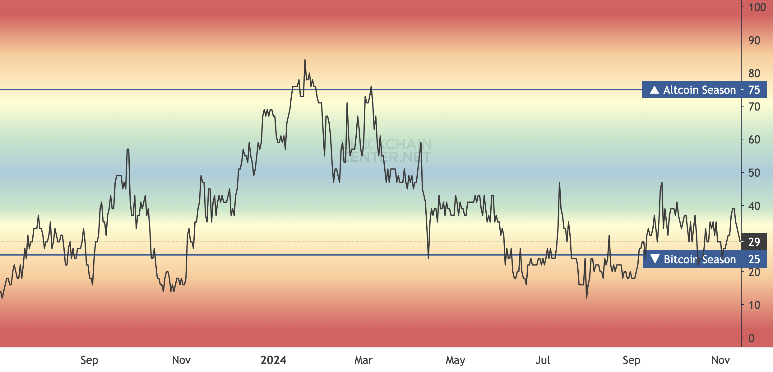 현재, Blockchaincenter의 알트코인 시즌 지수는 시장이 알트 시즌인지를 측정하며, 29로 한 단계 떨어졌습니다. 약 일주일 전에는 30이었습니다. 확인을 위해서는 상위 50개 암호화폐 중 최소 75%가 BTC를 능가해야 합니다.
