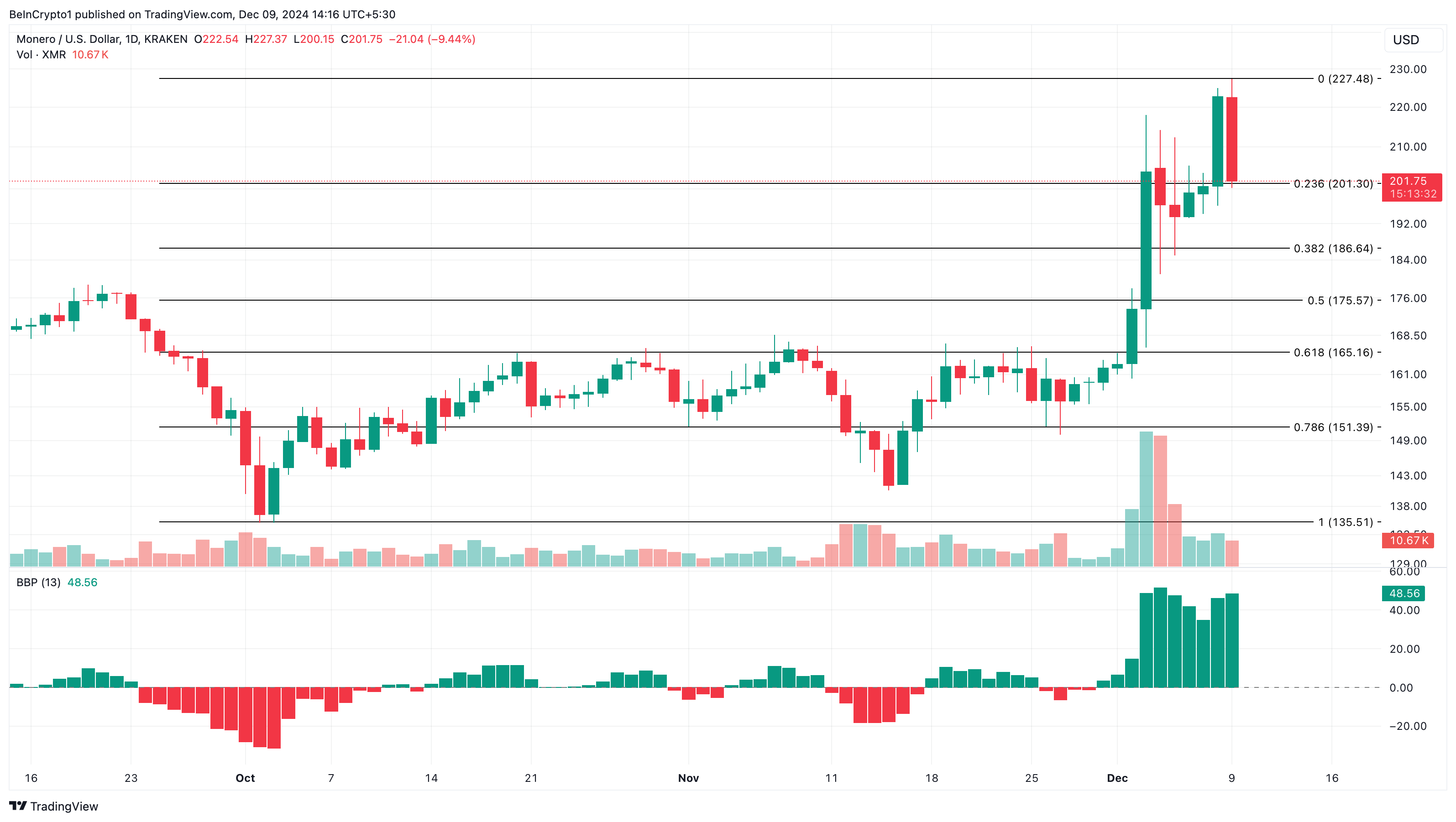 BBP가 상승하면 황소가 시장을 통제하고 있으며, 가격이 상승할 수 있음을 의미합니다. 반대로 지표가 하락하면 곰이 우위를 점하고 있으며, 가격이 하락할 수 있음을 나타냅니다. XMR 가격 차트를 자세히 살펴보면 최근 222.44달러의 정점에서 하락했습니다.