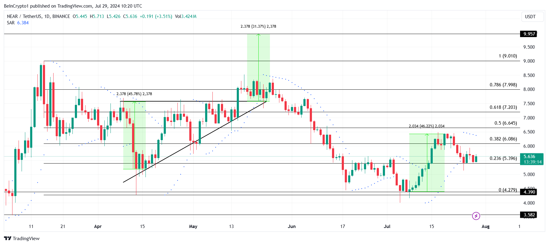5.63달러에 거래되고 있는 NEAR 가격은 23.6% 피보나치 되돌림선 위에 있습니다. 이 수준은 약세장 지지선으로 알려져 있으며, 약세 신호에도 불구하고 코인 가격이 추가로 하락하는 것을 어느 정도 막아주는 역할을 합니다.