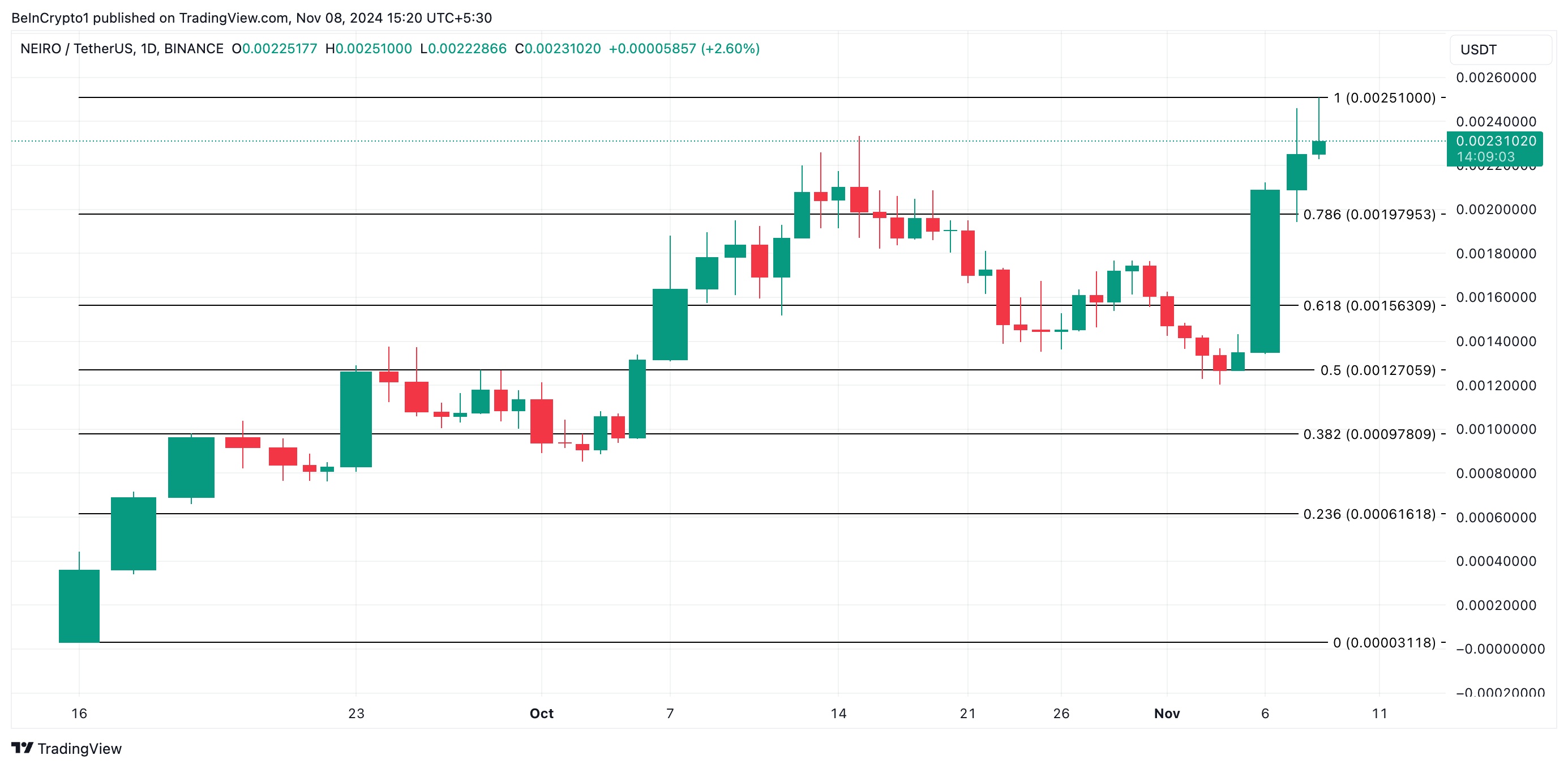 NEIRO는 현재 0.0023달러에 거래되고 있습니다. 최근의 매도세가 완화되고 밈코인에 대한 새로운 수요가 나타난다면, 그것은 사상 최고가인 0.0025달러를 회복하고 그 이상으로 상승할 수 있습니다.