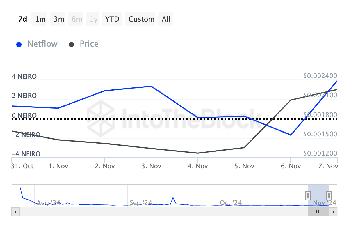 NEIRO의 고래투자자 또는 대규모 보유자들은 지난 주 동안 보유량을 늘리며 지속적인 성장에 대한 신뢰를 보여주었습니다. 인투더블록의 데이터는 지난 7일 동안 밈코인의 대규모 보유자 순유입이 266% 증가했다고 밝혔습니다.