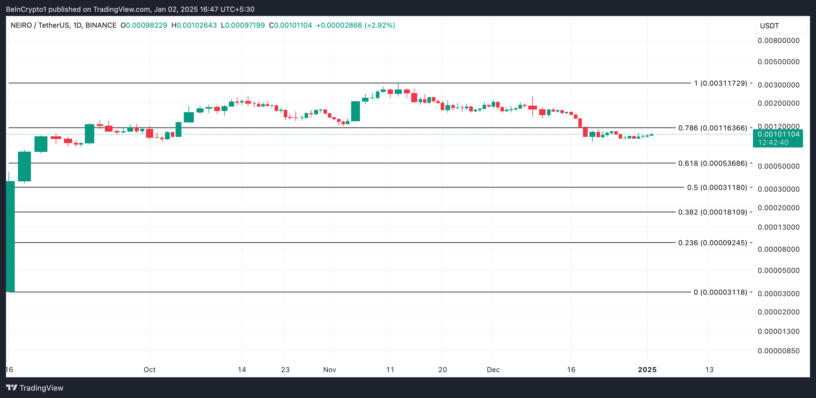 현재 NEIRO는 0.0010달러에 거래됩니다. 투자자들이 보유 시간을 늘리고 고래들이 축적 노력을 강화하면, 알트코인을 0.0011달러 저항 수준 이상으로 밀어 올릴 것입니다. 이 저항을 돌파하면 NEIRO의 가격은 사상 최고치인 0.0031달러로 향할 수 있습니다.