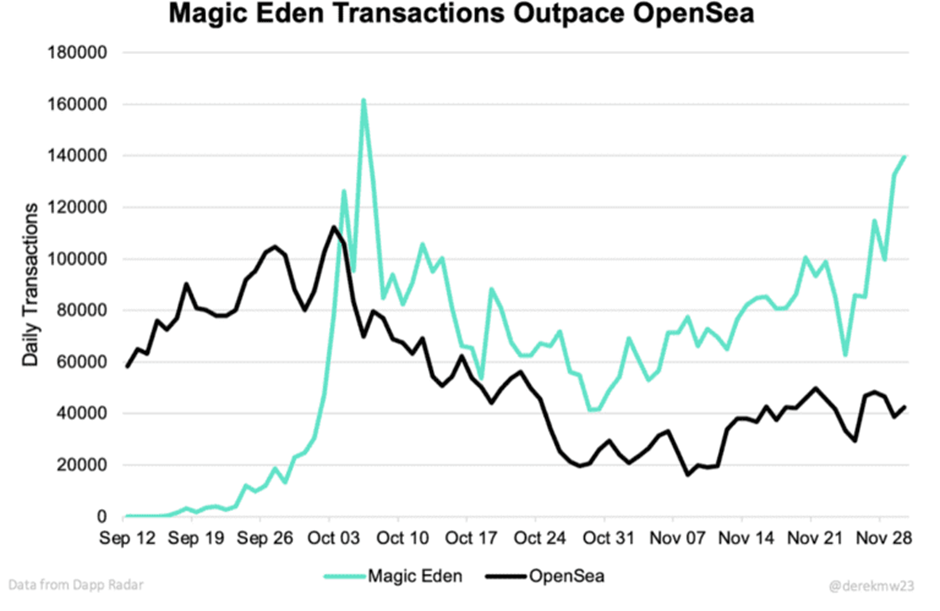 솔라나의 빠른 거래 속도와 낮은 수수료는 NFT 거래에 유리한 환경을 조성했고, 매직에덴은 이를 통해 경쟁력 있는 거래소로 성장했습니다. 특히 2021년 9월에는 솔라나 기반 NFT의 인기가 폭발적으로 증가하면서, 매직에덴은 기존의 이더리움 기반 거래소인 오픈씨(OpenSea)와 견줄 만한 위치에 오르게 되었습니다.