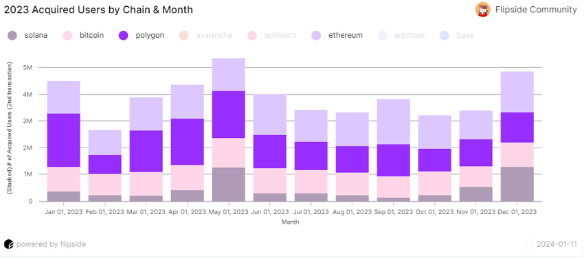 이 보고서는 ‘획득한 사용자’에 초점을 맞춥니다. 이들은 특정 체인에서 최소 두 번 이상 거래를 수행한 사용자입니다. 이더리움은 2023년에 이 지표를 사용하여 폴리곤을 약간 앞질렀습니다. 이더리움의 확보 사용자 수는 1,540만 명으로 한 해를 마감했으며, 폴리곤은 1,524만 명으로 그 뒤를 바짝 쫓고 있습니다.