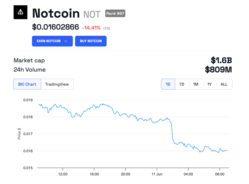 이러한 막대한 사용자 기반 덕분에 낫코인은 잠시 상위 50개 암호화폐에 이름을 올리며 주목을 받았습니다. 그러나 현재 0.016달러에 거래되고 있으며, 지난 24시간 동안 14% 하락한 시가총액은 약 16억 달러에 달합니다.