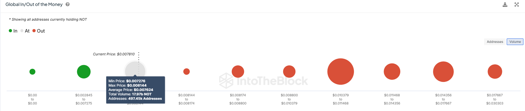 글로벌 인/아웃 오브 더 머니(GIOM) 지표에 따르면 투자자들은 0.0081달러에서 0.0072달러 사이의 가격대에서 약 179억 7000만 NOT을 구매했으며, 이는 거의 1억 4500만 달러에 달합니다. 이 토큰들은 시장 공급의 중요한 부분을 차지하며, 이 투자들을 수익성 있게 만들기 위한 수요는 가격을 높일 수 있습니다. 이 범위 내에서 구매한 투자자들은 0.0083달러 장벽을 돌파하여 투자 수익을 보기를 희망하고 있습니다.