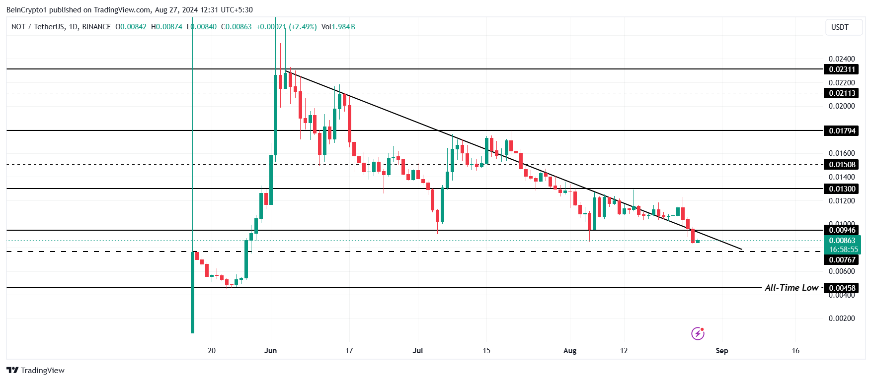 낫코인은 최근 3개월 동안 하락세를 돌파하려는 네 번의 시도에서 실패했습니다. 이 중 두 번은 NOT이 하락 추세선 위에서 마감했지만 상승을 유지할 수 없었습니다.