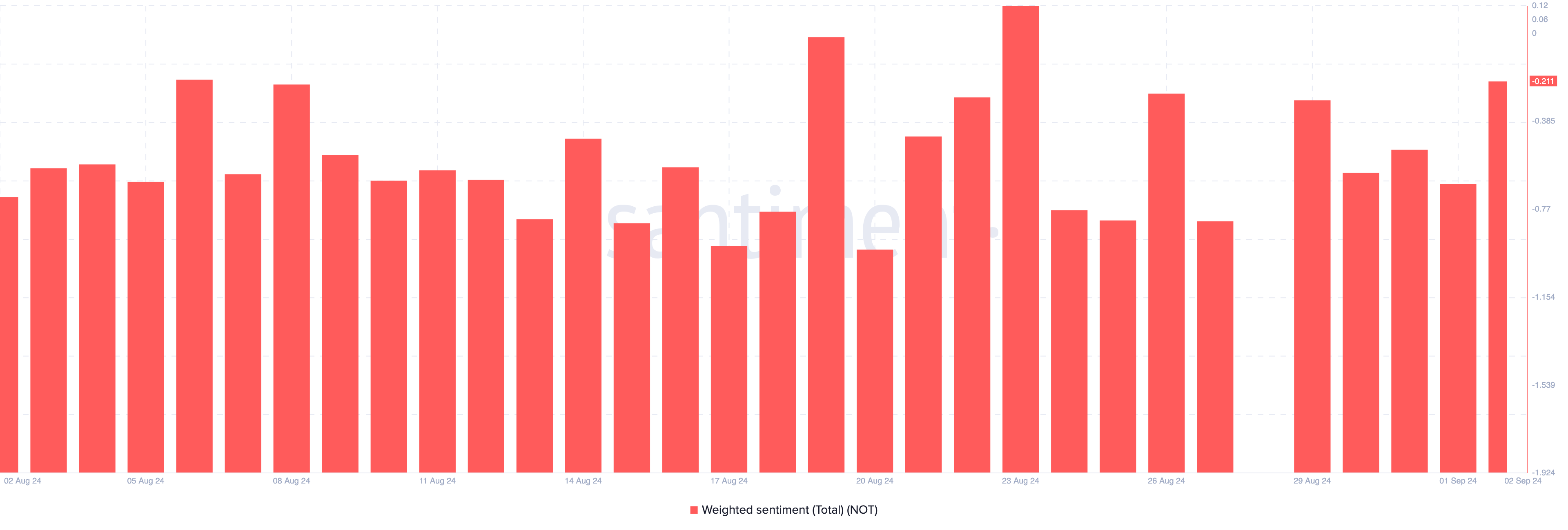이러한 어려움에도 불구하고 암호화폐 온라인데이터 플랫폼인 센티멘트(Santiment)의 데이터는 여론이 약세에서 강세로 전환되고 있음을 나타냅니다. 9월 1일에 Notcoin의 가중 여론은 -0.66이었습니다.