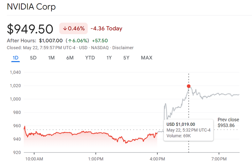 발표 후 NVDA의 주가는 급등하여 1,000달러를 돌파했습니다. 시간 외 미국 증시에서 17:32(동부 표준시)에 NVDA는 1,019달러에 거래되었습니다. 하지만 현재 이 글을 쓰는 시점에서는 1,007달러로 가격이 수정되었습니다.