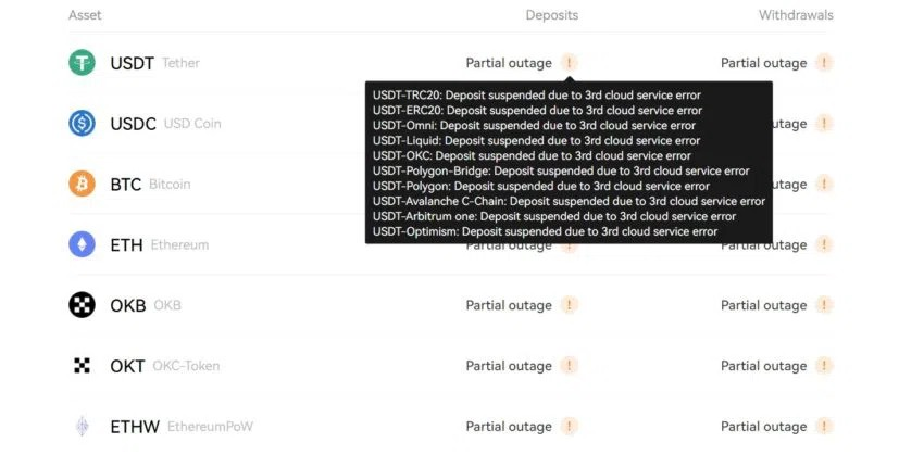 기사가 작성 당시 OKX 상태 페이지에는 OKX가 자사 플랫폼에서 입출금을 처리하지 않고 있는 것으로 나타났다. OKX에 따르면 이들 서비스는 ‘3차 클라우드 서비스 오류’로 중단됐다.