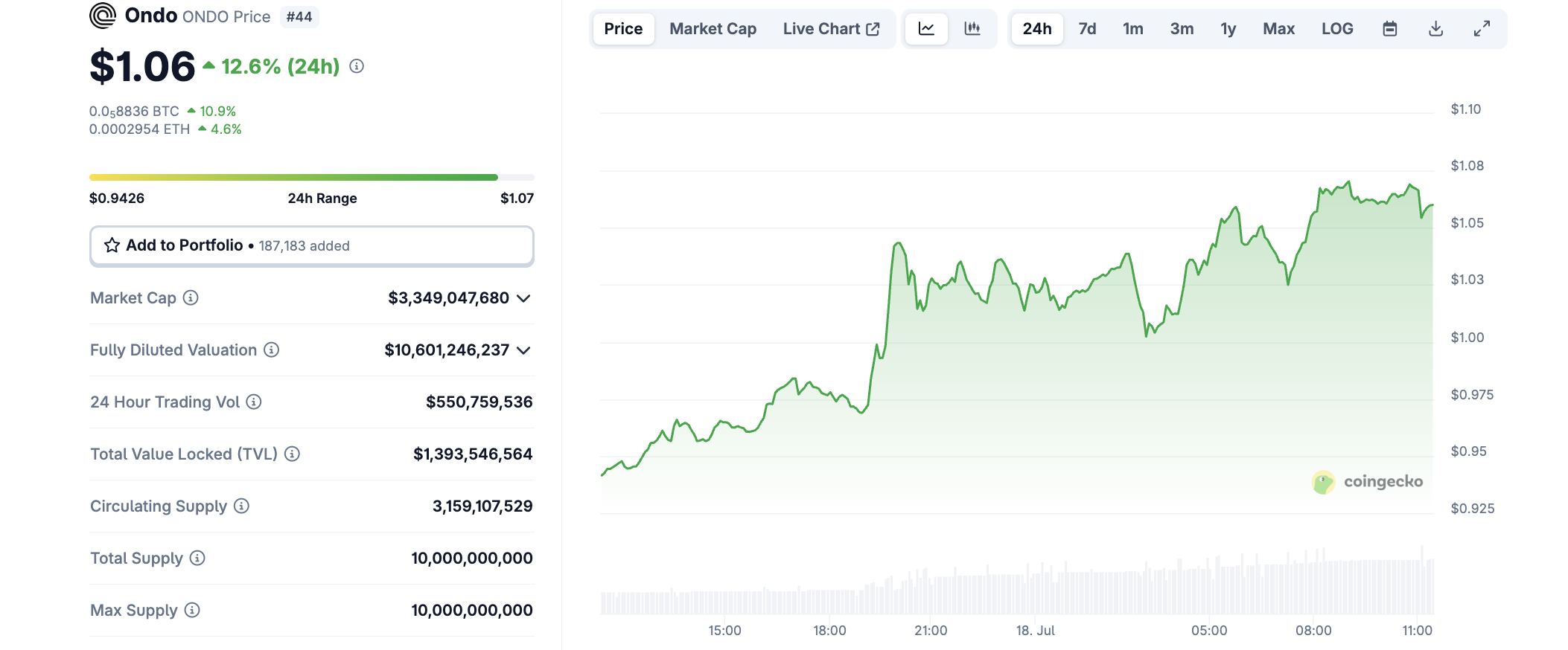 이 소식 이후 ONDO 토큰 가격이 12.6% 상승했습니다. 이는 토큰화된 현실세계 자산(RWA) 부문의 확장 가능성에 대한 투자자들의 강한 신뢰를 반영합니다.