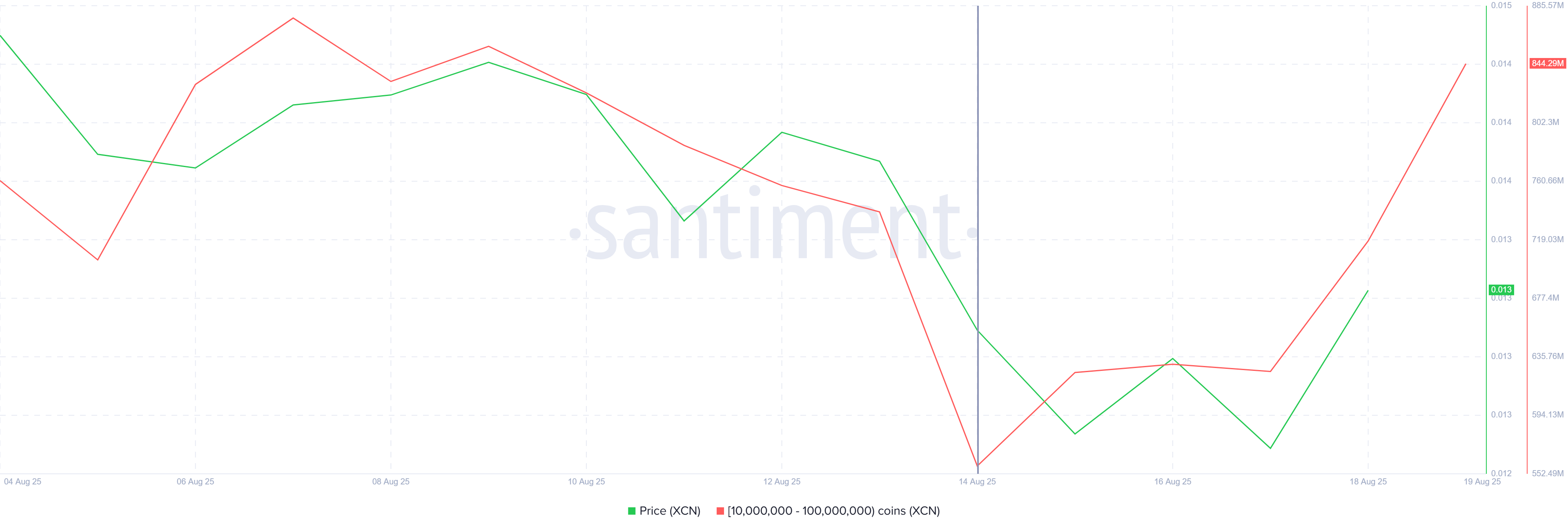 현재 XCN은 0.01331달러에 거래되고 있으며, 0.01241달러의 지지선에서 반등한 후 지난 24시간 동안 7% 상승했습니다. 강력한 고래의 축적이 이 상승에 기여했을 수 있으며, 대형 보유자들이 잠재적인 가격 회복을 위해 포지션을 잡고 있습니다.