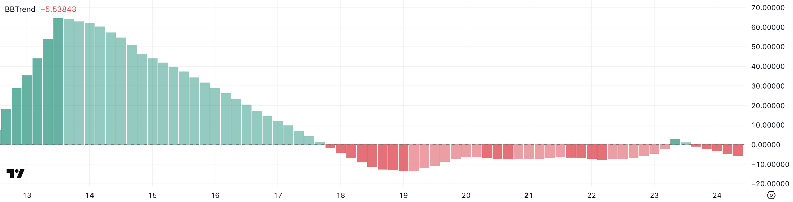 BBTrend(볼린저 밴드 트렌드)는 가격 추세의 강도와 방향을 식별하는 데 도움을 주는 변동성 기반 모멘텀 지표입니다. +1 이상의 수치는 강한 상승세를, -1 이하의 수치는 강한 하락세를 나타냅니다.