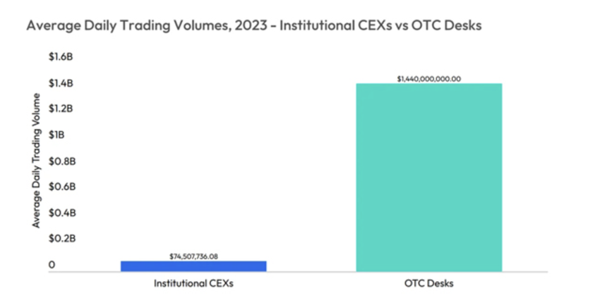 2023년 OTC 데스크의 일일 평균 거래량은 14억 4천만 달러를 기록했습니다. 그러나 기관 중앙화 거래소는 평균 약 7,450만 달러를 기록했습니다.
