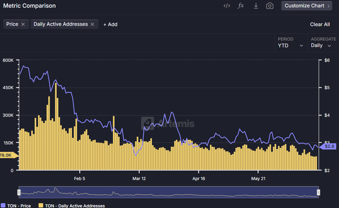 오픈 네트워크의 활동은 매우 저조합니다. 6월 25일 기준으로, 활성 지갑은 7만8000개에 불과하며, 이는 올해 기록된 최저 수준입니다. 아르테미스에 따르면, 이는 연초 45만개 이상의 활성 지갑에서 82% 이상 감소한 것입니다.