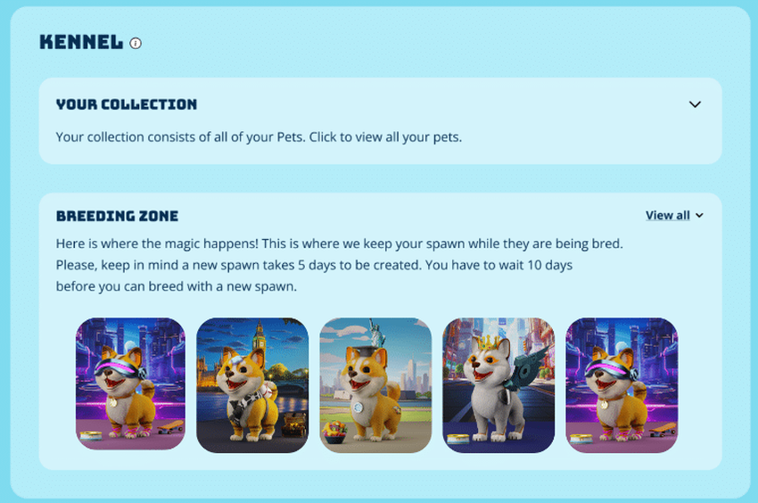 Sponsored Sponsored사용자의 케넬(kennel)에서는 브리딩을 진행 중인 펫을 확인할 수 있다. 브리딩 신청 후 5일 동안 새로 얻게 될 펫은 대기 중(pending)으로 표시된다. 새로운 NFT 펫이 도착할 때까지 남은 시간도 실시간으로 확인할 수 있다.
