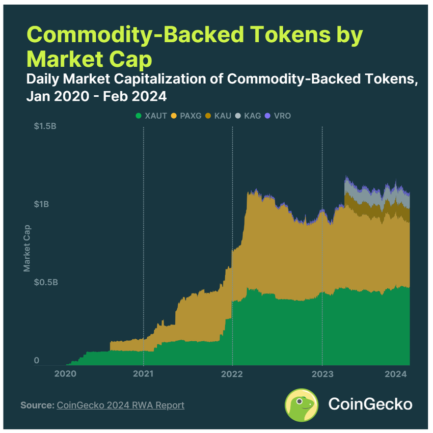 팍소스의 토큰화에 대한 집중은 시장 트렌드와도 일치합니다. 코인게코의 RWA 보고서 2024는 팍소스의 PAX 골드(PAXG)와 같은 토큰화된 귀금속이 상품 기반 토큰 시가총액의 83%를 차지하고 있음을 보여줍니다. 1트로이 온스의 실물 금으로 뒷받침되는 이 토큰의 시가총액은 11억 달러에 달합니다.