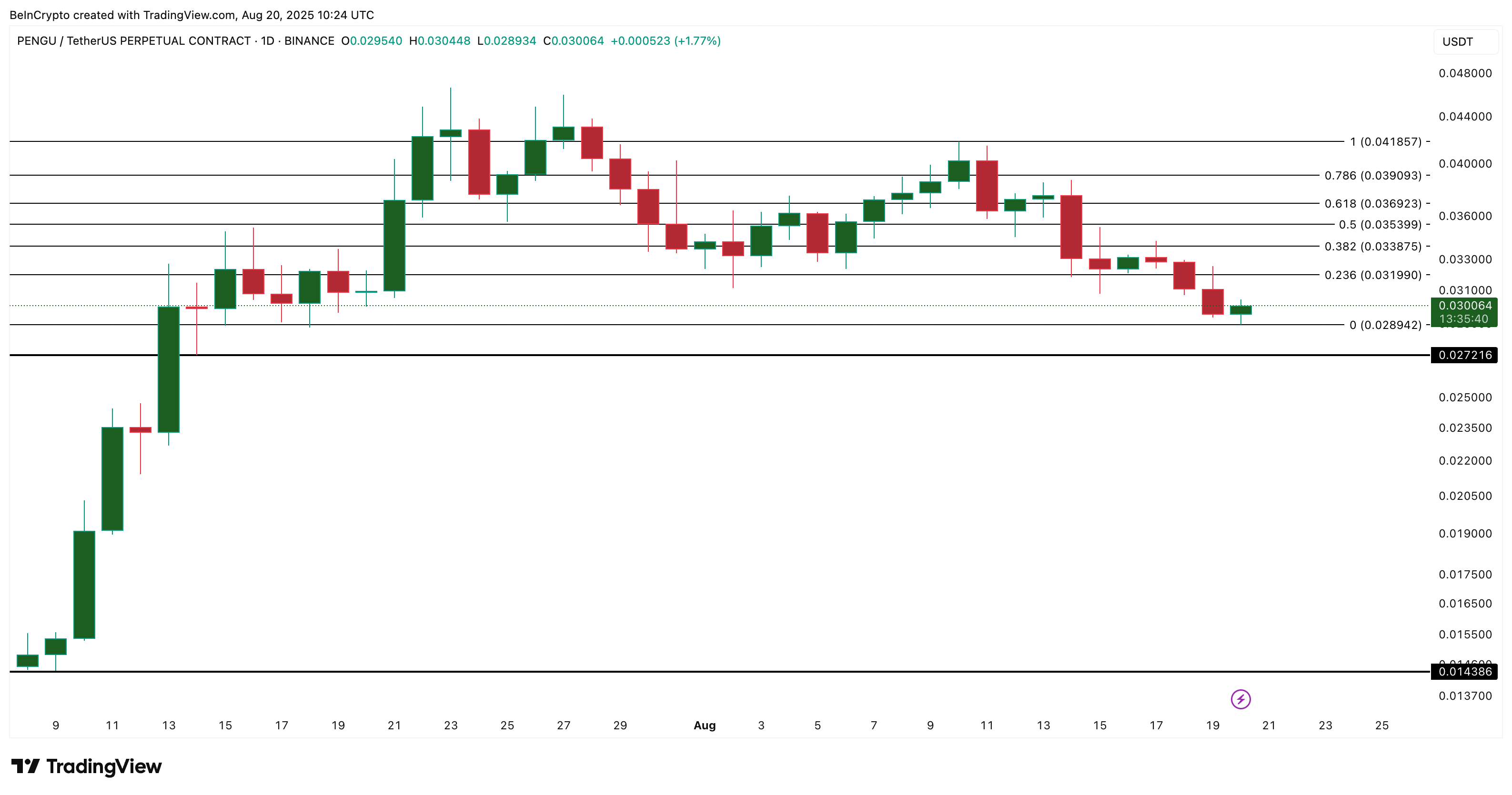 펭구 가격은 현재 일일 차트의 피보나치 되돌림에서 0.028달러–0.030달러 구역의 지지에 매달려 있습니다. 0.028달러 아래로의 돌파는 0.027달러로의 빠른 하락을 열어주며, 만약 그 지지가 유지되지 않으면, 다음 가시적인 지지는 0.014달러 근처에 있습니다.