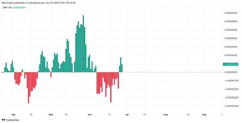 상당한 매도세가 이어질 위험이 남아 있지만, PEPE에 대한 강세 편향은 여전히 높습니다. 밈 코인의 엘더-레이 지수가 이를 증명합니다. 보도 시점에 이 지표의 값은 0.00000094 으로 0보다 높습니다.
