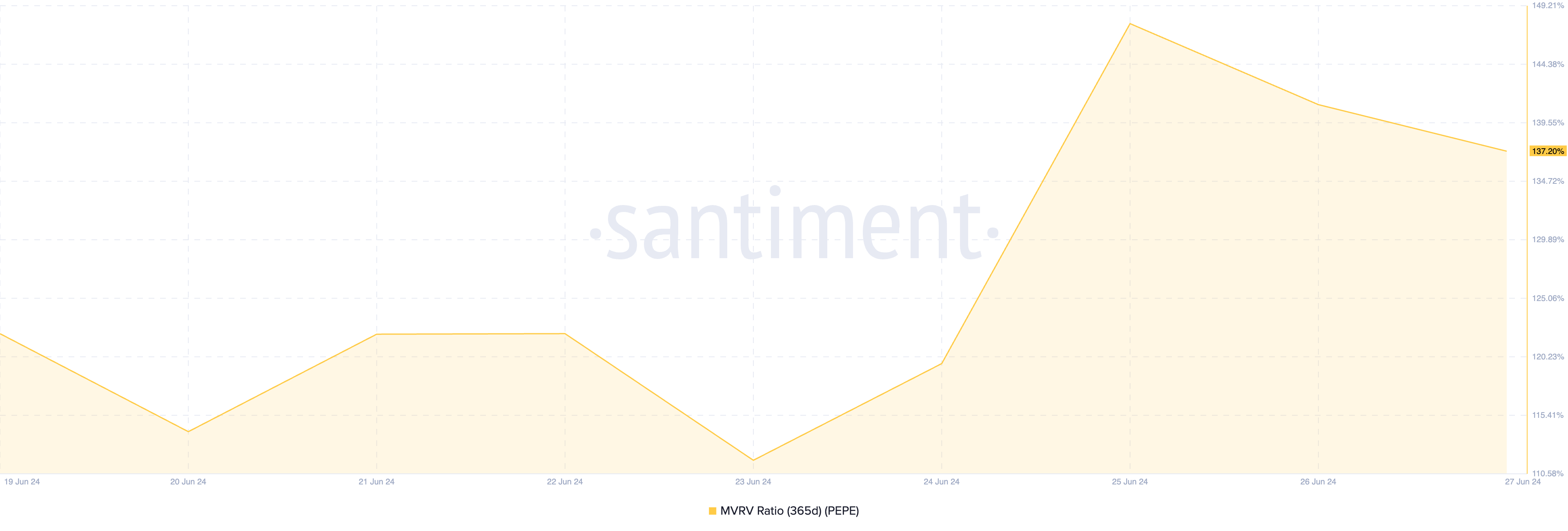그러나 PEPE의 시장가치 대비 실현가치(MVRV) 비율은 가격 반전 가능성을 암시합니다. 보도 시점에 이 지표의 값은 137.20%입니다.