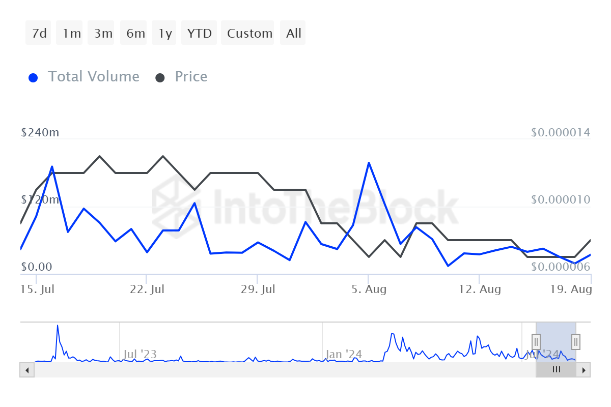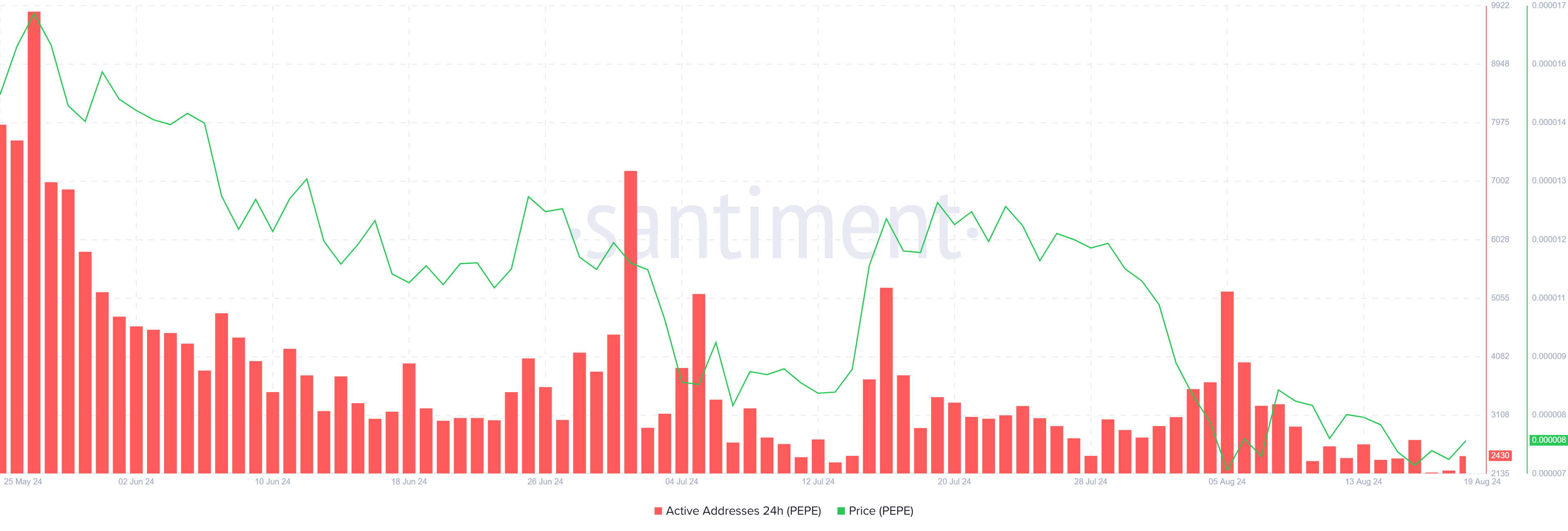 PEPE는 고래 투자자들이 계속해서 거래에서 한 발짝 물러서면서 네트워크 전반의 참여가 큰 타격을 입었습니다. 현재 활성 주소는 회복이 이루어지지 않아 6개월에 머물러 있어 투자자들이 보유 자산을 옮길 유인이 없습니다.