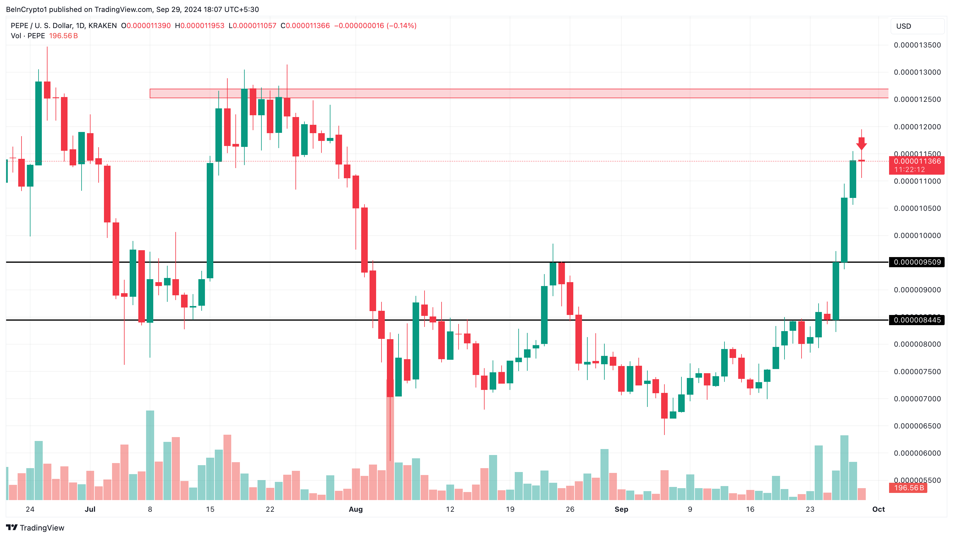 현재 PEPE의 가격은 0.000011달러입니다. 그러나 일일 차트는 밈 코인이 0.000013달러의 공급 구역에 진입하려고 할 때 매도 신호가 나타나는 것을 보여줍니다.