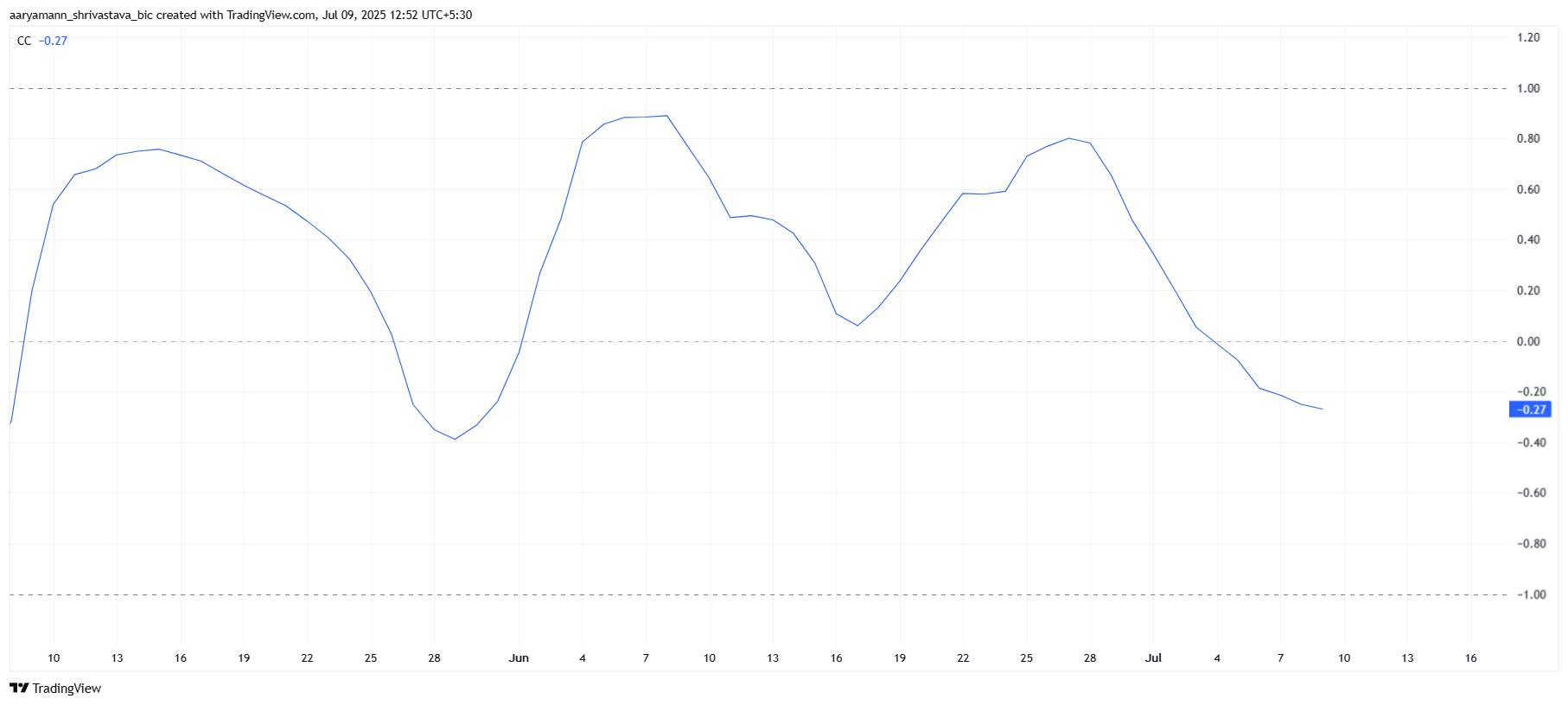 Pi 코인은 비트코인과의 상관관계에서 극적인 변화를 겪었으며, 현재 -0.27의 음수 상관관계를 보이고 있습니다. 이 음수 상관관계는 Pi 코인이 비트코인과 반대 방향으로 움직이고 있음을 의미합니다. 간단히 말해, 비트코인이 상승할 때 Pi 코인은 계속 어려움을 겪고 있습니다.