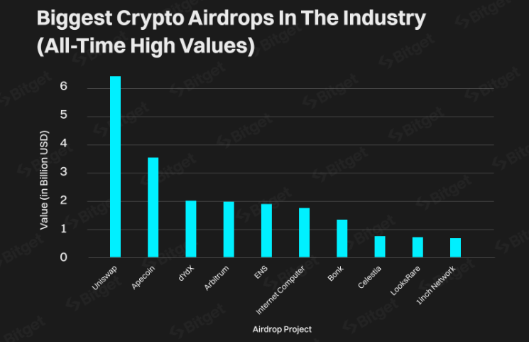 비트겟 거래소의 보고서에 따르면, 유니스왑은 2020년 할당 이후 64억3000만 달러의 가치를 기록하며 암호화폐 에어드롭 분야에서 선두를 차지했습니다. 그러나 최근 파이 네트워크는 이 기록을 초과하여 유니스왑의 에어드롭 가치를 두 배로 늘렸습니다.