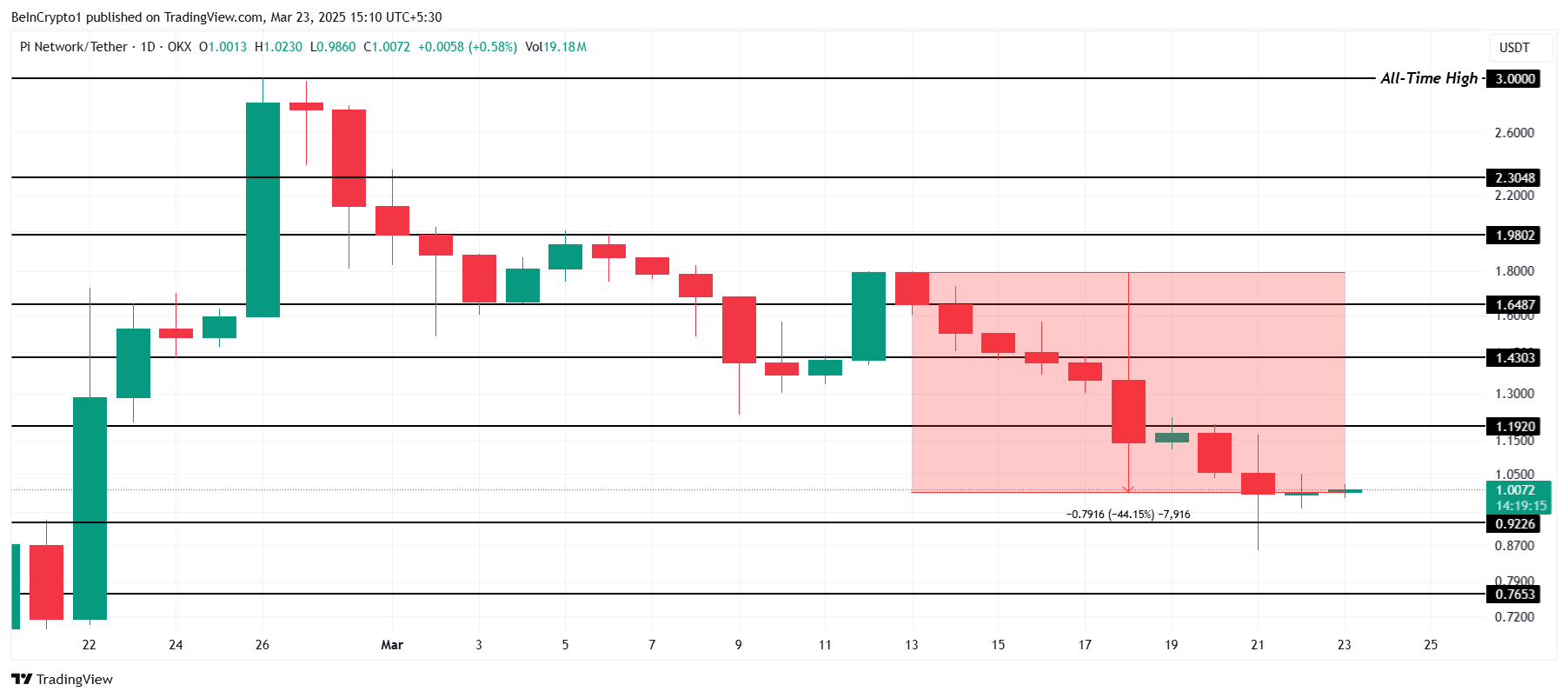 현재 파이 네트워크는 1.00달러에 거래되고 있으며, 지난 10일 동안 44% 하락했습니다. 알트코인은 이 가격대를 유지하려고 시도하고 있으며, 비교적 성공적으로 유지하고 있습니다.