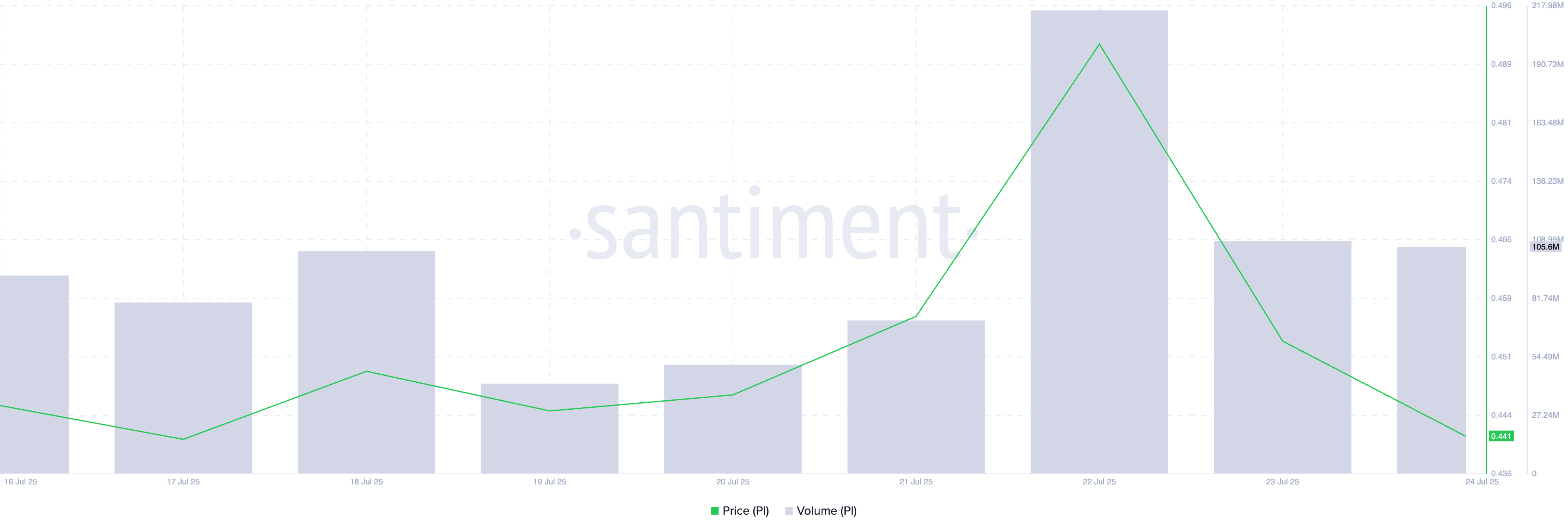 PI 토큰 가격은 7월 15일부터 0.43달러의 지지선과 0.46달러의 저항선 사이에서 벗어나지 못하고 있습니다. 상단 경계를 넘기 위한 여러 시도가 있었지만, 수요가 약해 각 랠리가 실패하여 토큰을 다시 횡보하게 만들었습니다. 토큰을 강제로 다시 횡보하게 만들었습니다.