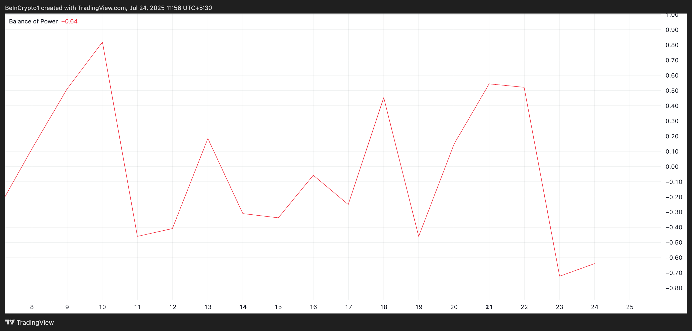 BoP 지표는 시장에서 매수자와 매도자의 강도를 측정합니다. 값이 양수일 때, 매수자가 시장을 지배하고 새로운 가격 상승을 주도합니다.