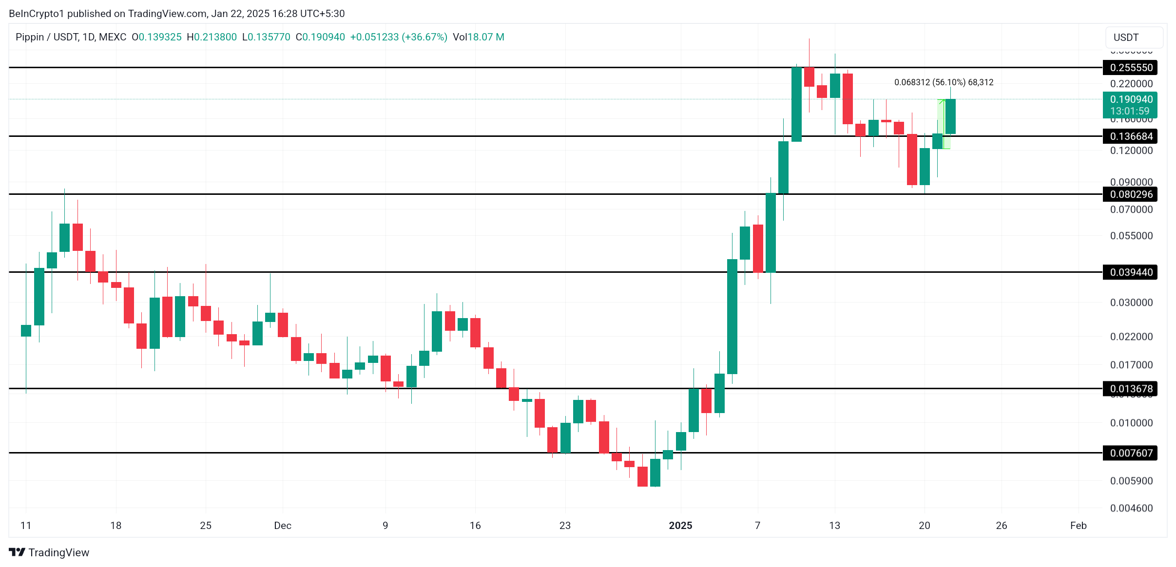 PIPPIN의 가격은 지난 24시간 동안 56% 상승하여 현재 0.190달러에 거래되고 있습니다. AI 에이전트 토큰은 이 모멘텀을 유지하기 위해 0.136달러를 지지 수준으로 확보해야 합니다. 성공적으로 이를 달성하면 추가 가격 상승에 필요한 안정성을 제공할 것입니다.
