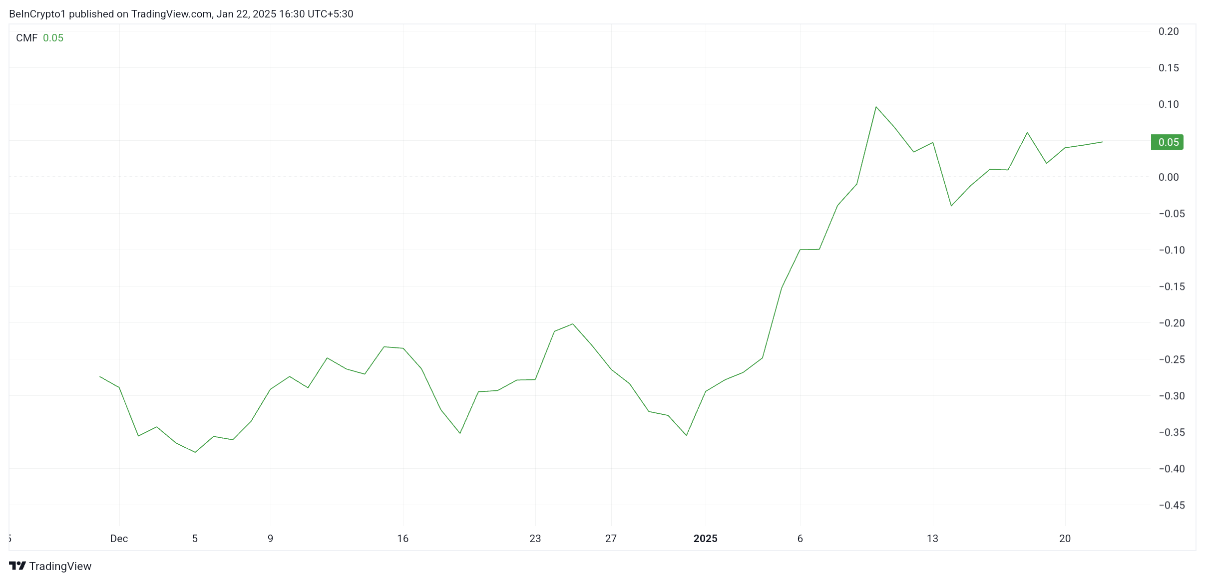 차이킨 머니 플로우(CMF) 지표는 PIPPIN에 대한 투자자 관심이 증가하고 있음을 반영합니다. CMF의 상승은 자산으로의 자본 유입을 나타내며 강한 시장 신뢰를 강조합니다. 이 증가된 유동성은 PIPPIN이 단기 이익 실현 압박을 극복하는 데 도움을 줄 수 있으며, 상승세가 유지되도록 보장합니다.
