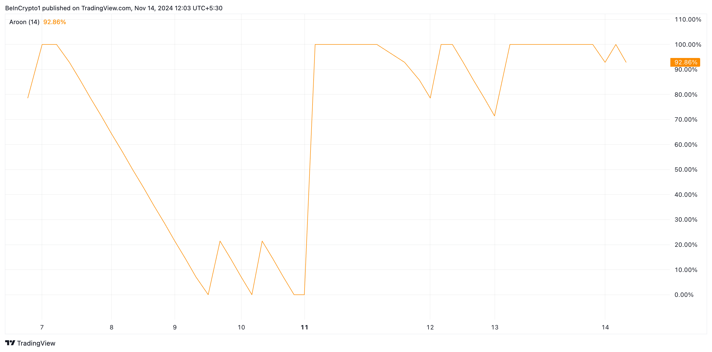 또한, 이 밈코인의 아룬 상승선은 92.86%로, 이 긍정적인 전망을 확인합니다. 아룬 지표는 추세의 강도와 방향을 식별합니다.