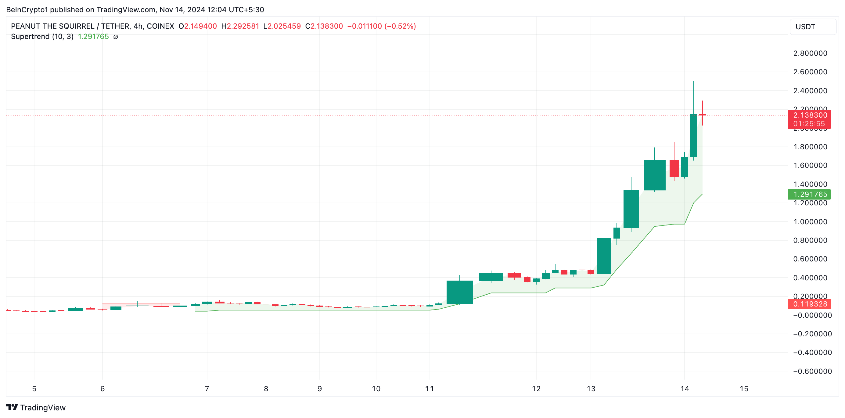 PNUT의 경우처럼, 슈퍼 트렌드 선이 녹색으로 바뀌고 자산 가격 아래에 나타나면, 구매자가 통제하고 있습니다. 녹색 선은 지지 바닥 역할을 하여 자산 가격이 구매 압력을 받고 반등할 수 있는 지점입니다. PNUT의 경우 이는 1.29달러입니다.
