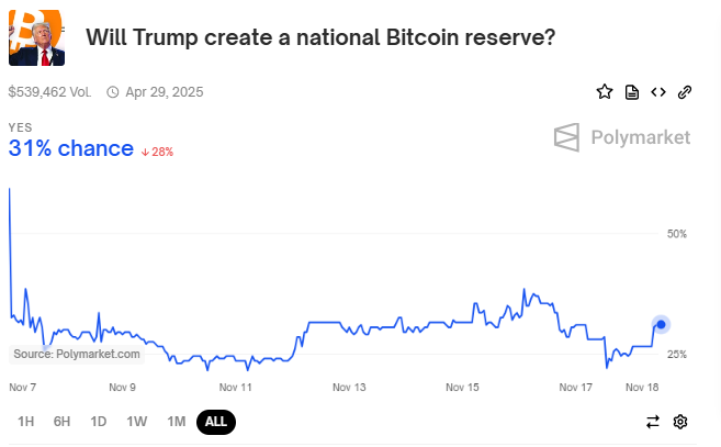 폴리마켓의 확률은 그의 견해를 공유합니다. 트럼프의 승리를 성공적으로 예측한 분산 예측 시장은 트럼프가 미국 비트코인 예비고를 설립할 가능성이 31%에 불과하다고 보여줍니다.