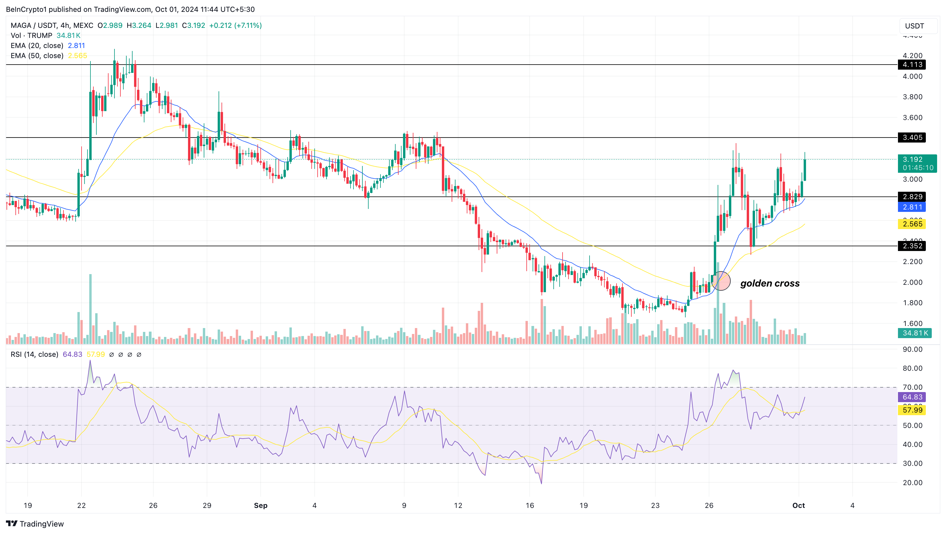 아래에서 볼 수 있듯이, 20 EMA(파란색)가 50 EMA(노란색)를 넘어섰습니다. 그 외에도, 상대 강도 지수(RSI)는 모멘텀을 측정하며 현재 신호선 위에 있어 강세론을 강화합니다.
