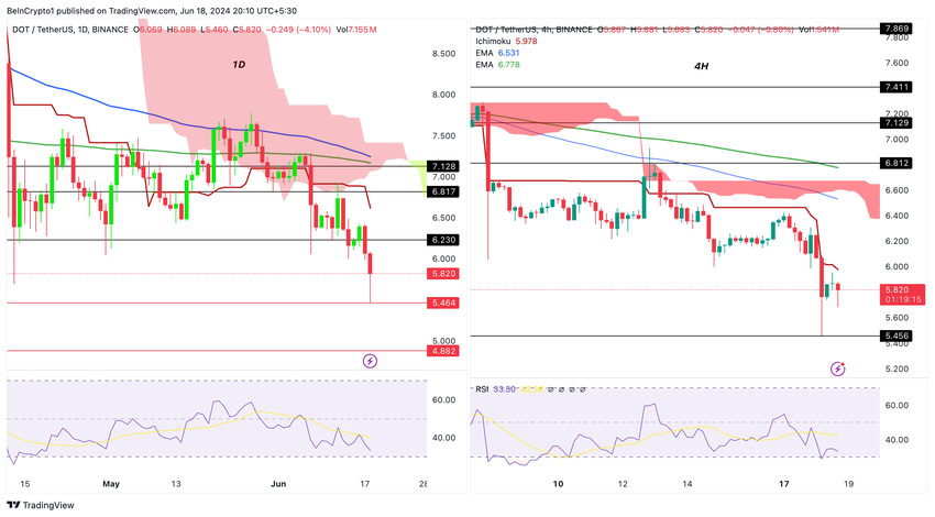 현재 폴카닷은 몇 가지 주요 지지선과 저항선에 직면해 있습니다. 비인크립토 분석에서 공유한 인사이트에 따르면, 어제 DOT 가격은 6.23달러를 하회했습니다. 이로 인해 가격은 이틀 만에 12% 하락했으며, 이 가격 수준 모니터링의 중요성을 강조하고 보여줍니다. 이 가격 수준은 이제 DOT의 저항선으로 작용할 것입니다.