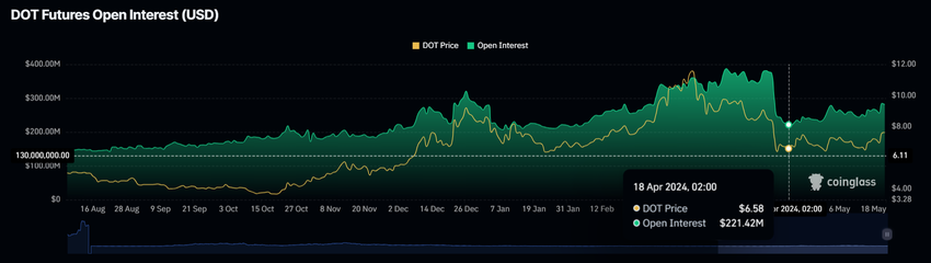 미청산계약(OI)은 아직 결제되지 않은 선물 또는 옵션과 같은 활성 파생상품 계약의 총 수를 의미합니다. DOT의 경우, 이 미결제약정 잔고가 불과 3일 만에 6,300만 달러 이상 증가하여 총 2억 2,100만 달러에서 2억 8,400만 달러로 늘어났습니다.