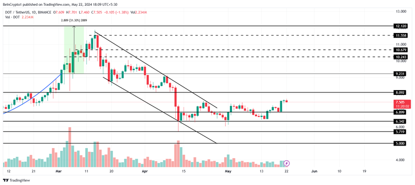7.50달러에 거래되고 있는 폴카닷의 가격은 저항선인 8.0달러 돌파에 근접해 있습니다. 이 저항선을 지지선으로 전환하면 과거에 상승하기 전에 지지선 역할을 했기 때문에 가격이 더 상승할 수 있습니다.
